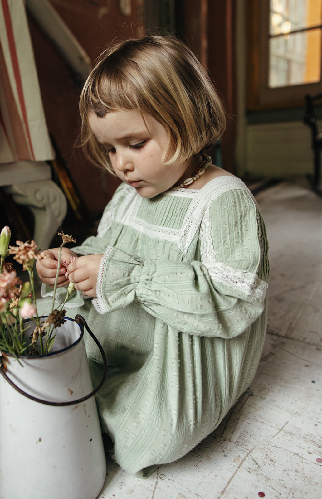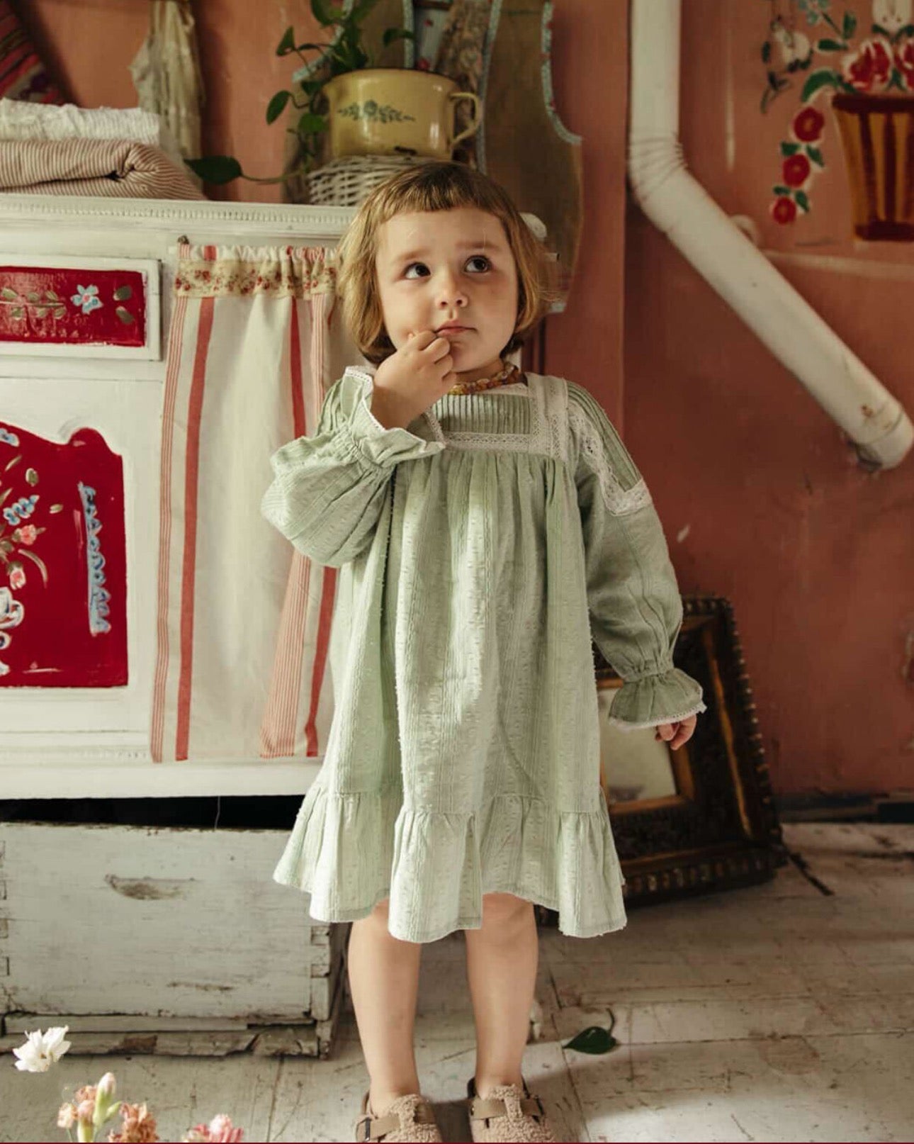 Louise Misha, Dress Laureline Almond 雷琳荷葉花蕾絲羽毛紋理洋裝 杏仁綠 18m-4y