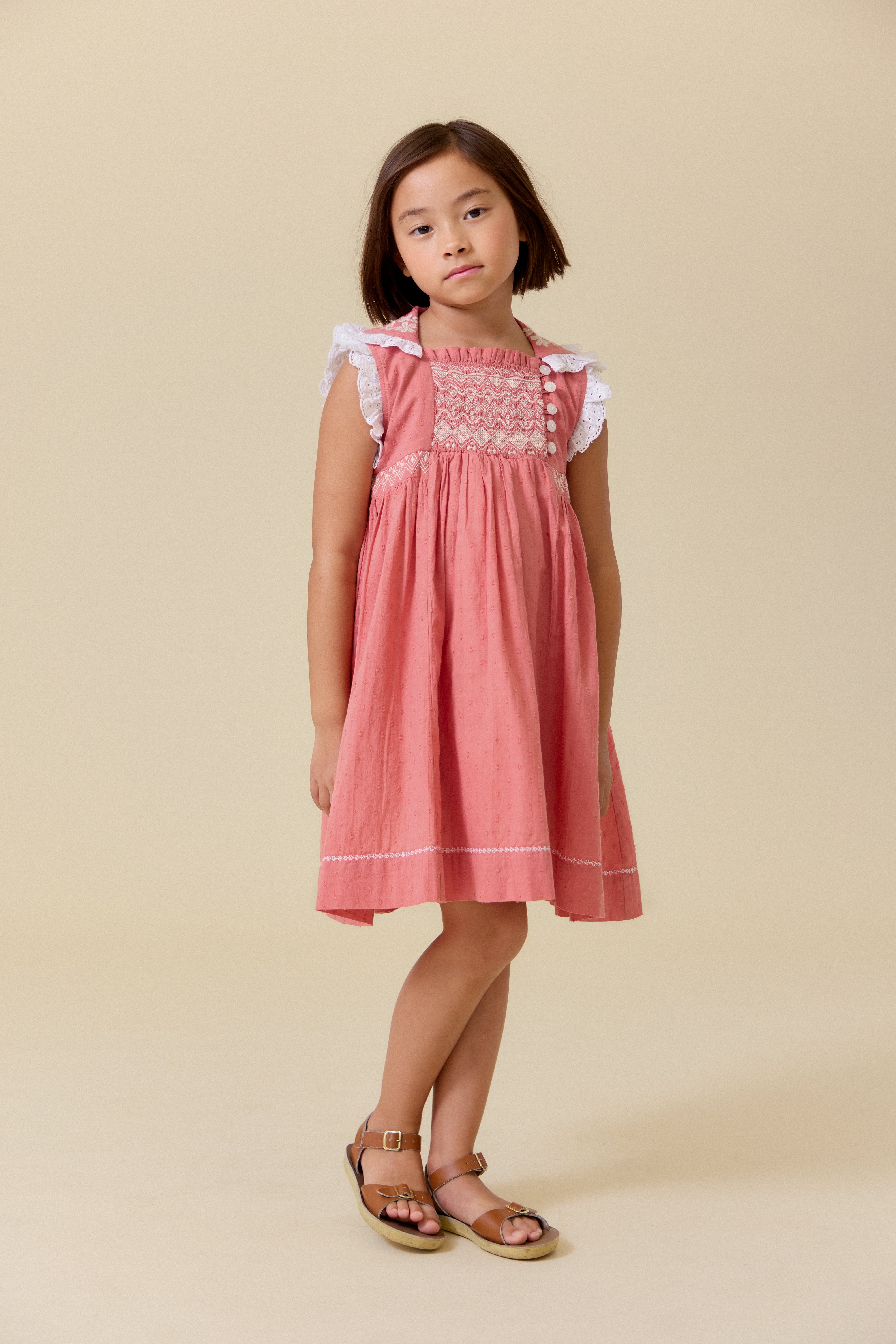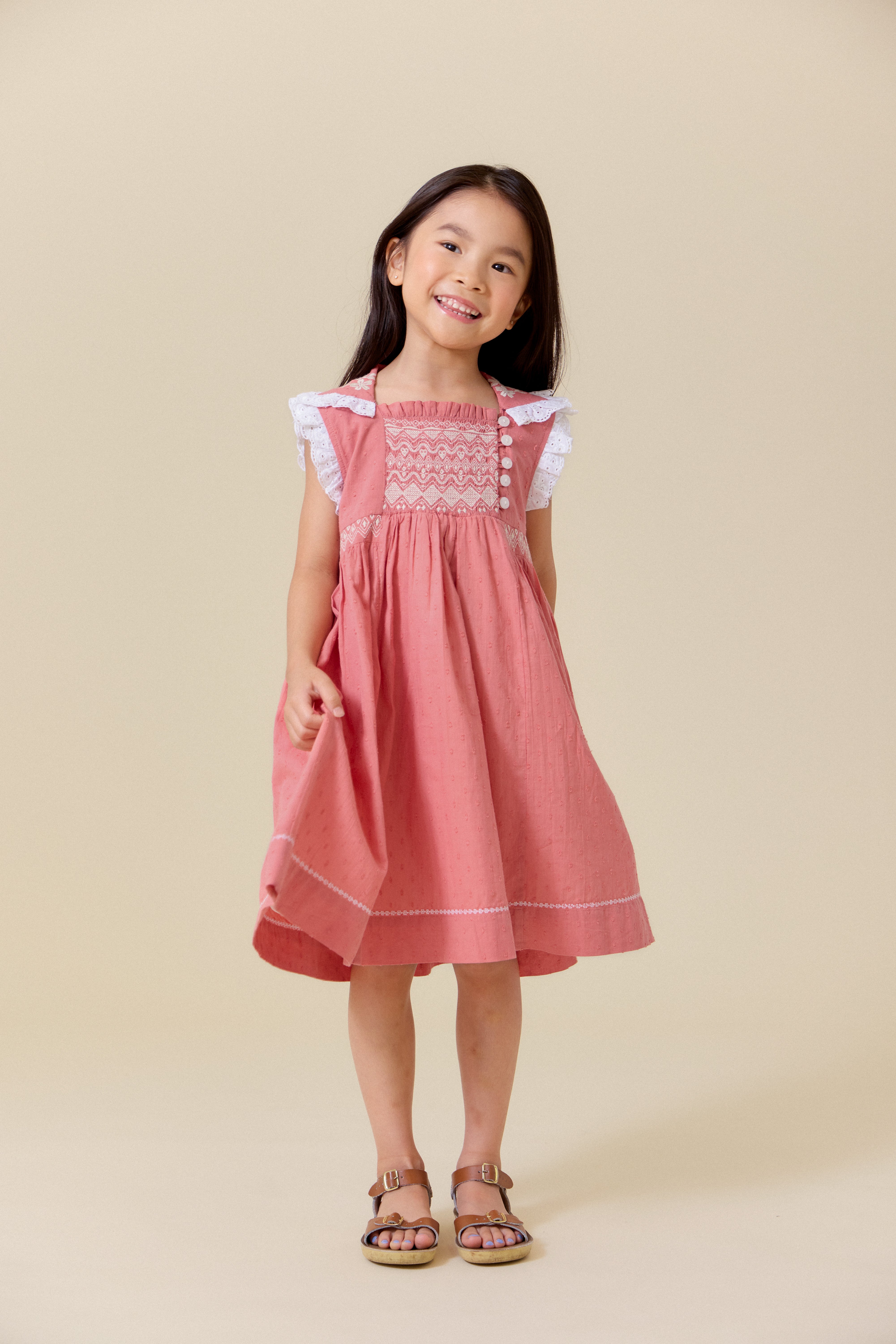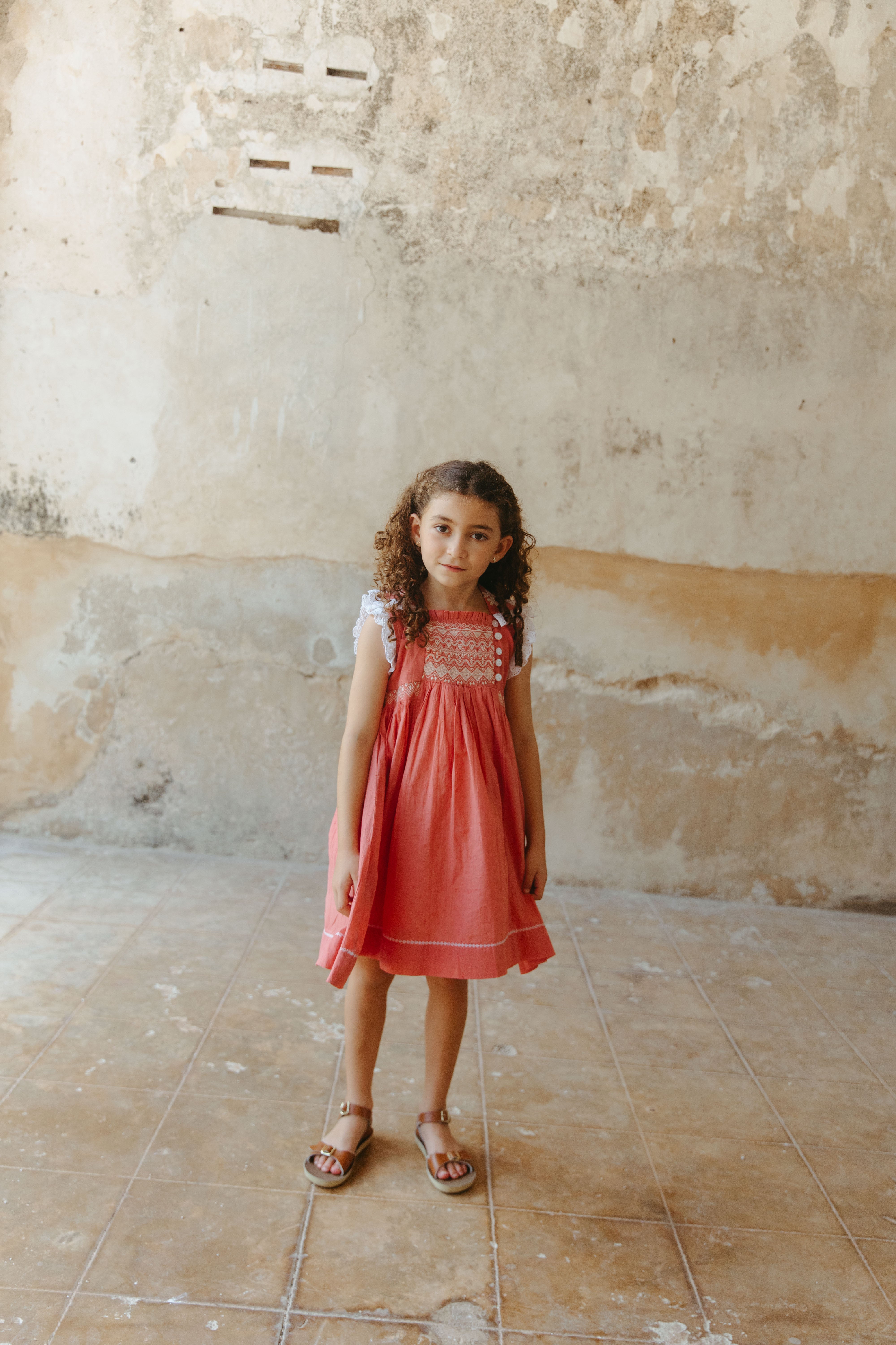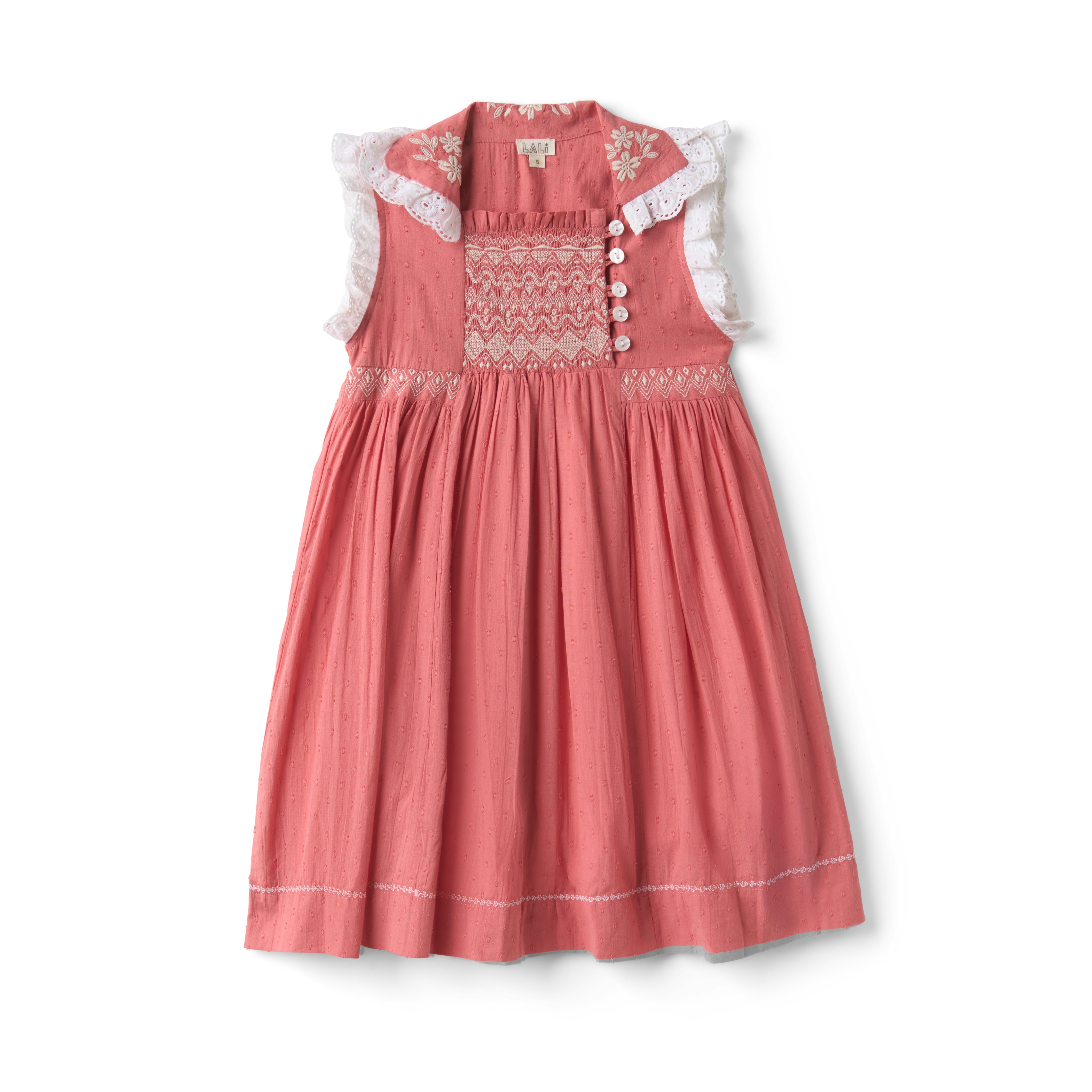 這款全新演繹的伊斯拉連身裙,採用瑞士圓點提花棉面料,並配有全襯裡,穿著舒適。其亮點在於精美的褶襉圍兜,飾以巴希卡塔刺繡和鏤空花邊,展現質感與藝術氣息,成為引人注目的視覺焦點。領口周圍的精緻刺繡更添一絲優雅,讓這款洋裝既別緻又易於穿著,適合各種場合。