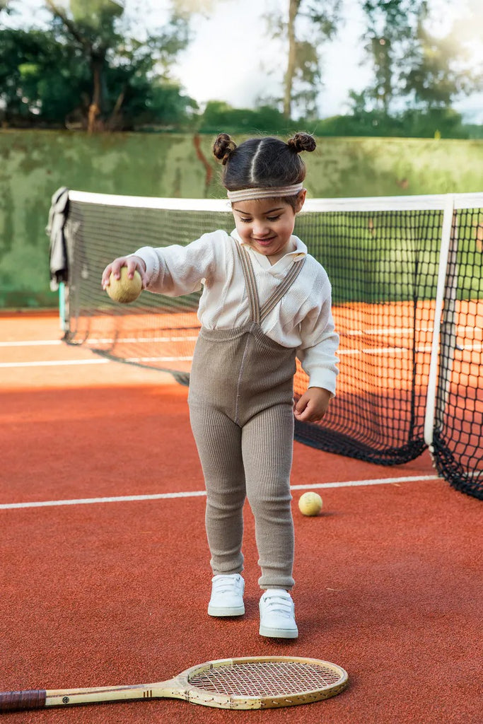 作為我們 Retro Champs SS25 系列的一部分,這件作品捕捉了活力和嬉戲的精神,並帶有一絲復古魅力。其特色是牡蠣灰、奶油色和淺棕色條紋背帶。