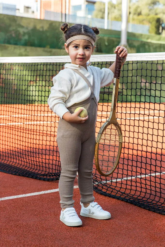 Part of our Retro Champs SS25 Collection, this piece captures the spirit of energy and playfulness with a dash of retro glamour. It features striped braces in tones of oyster grey, cream, and light brown.
