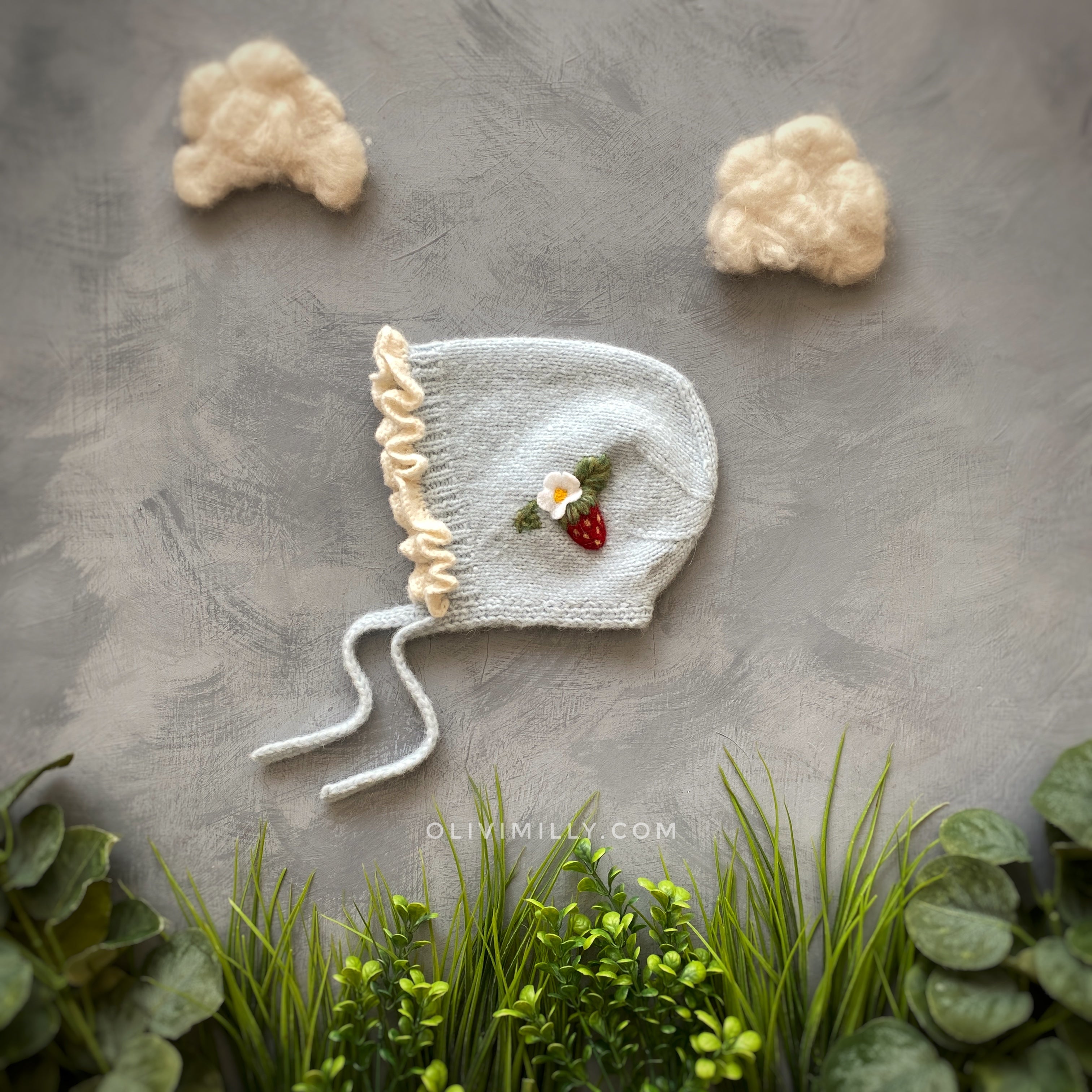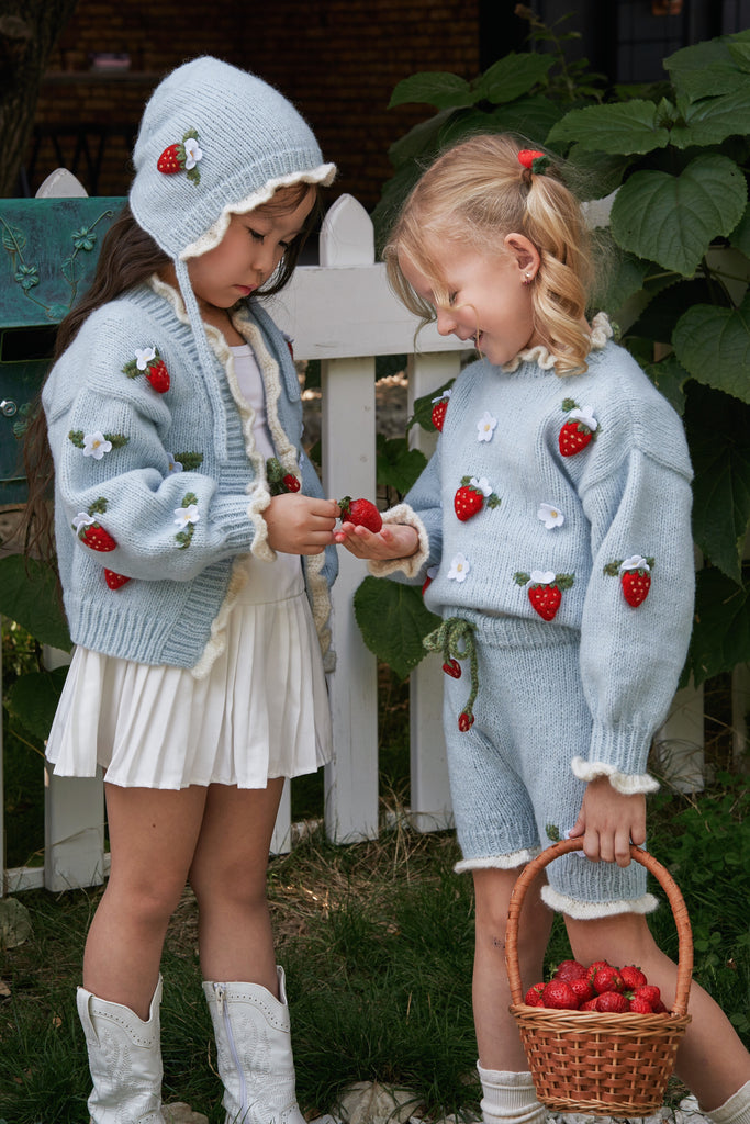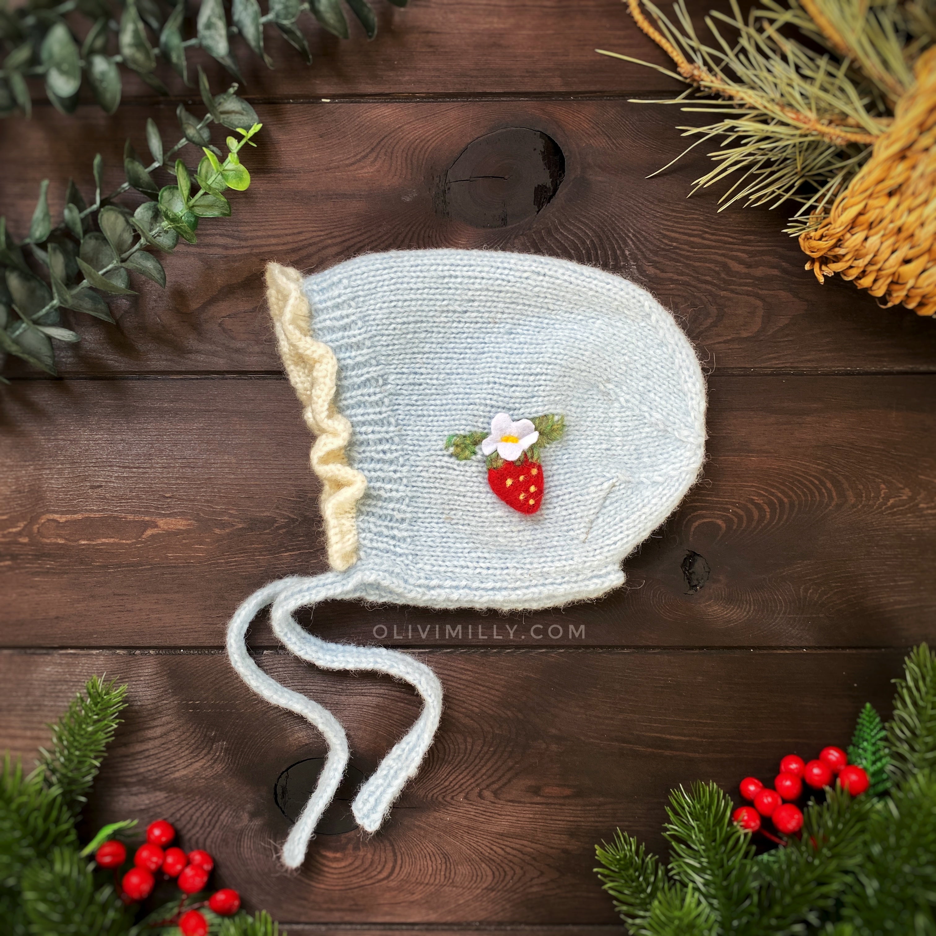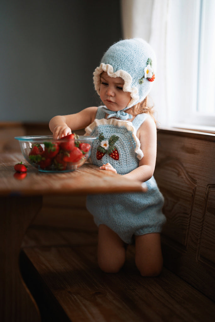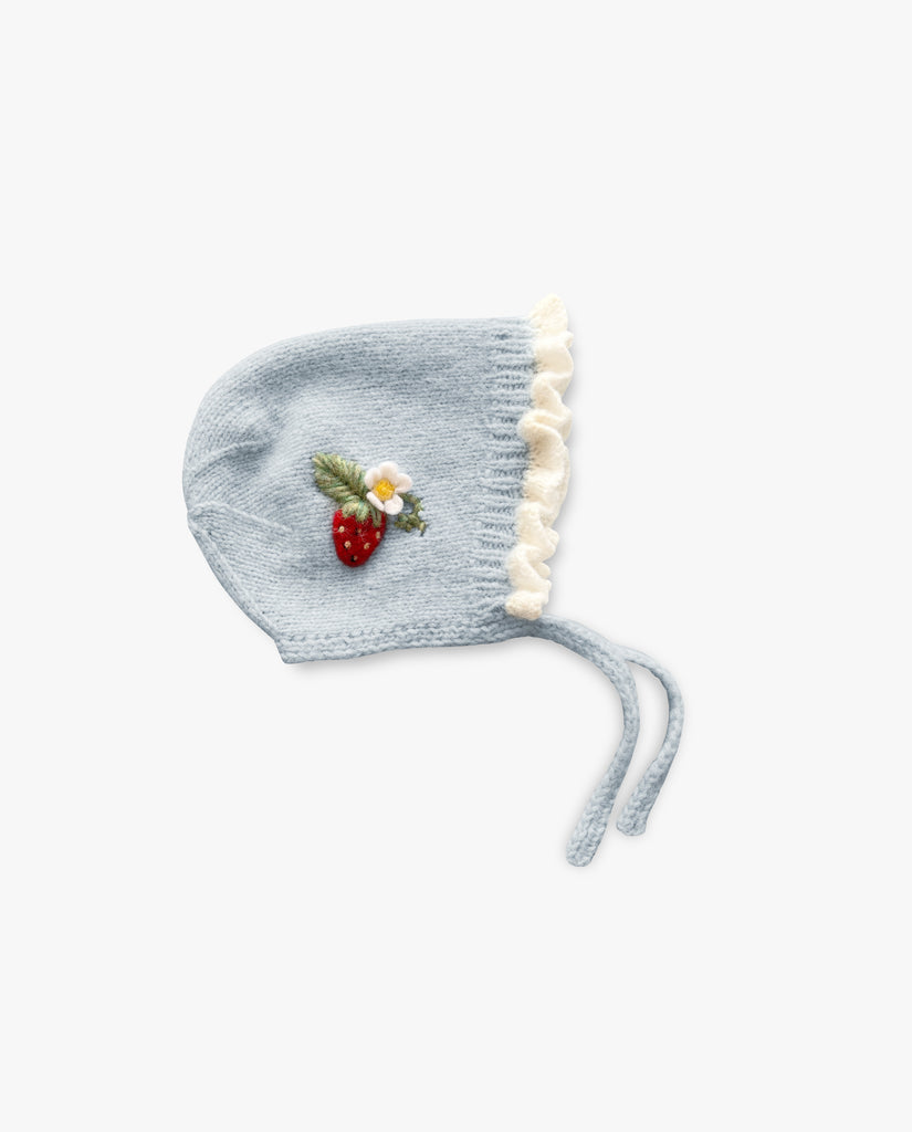 OliviMilly, Strawberries Bonnet - Blue 草莓荷葉針織帽 柔和藍 0-6y
